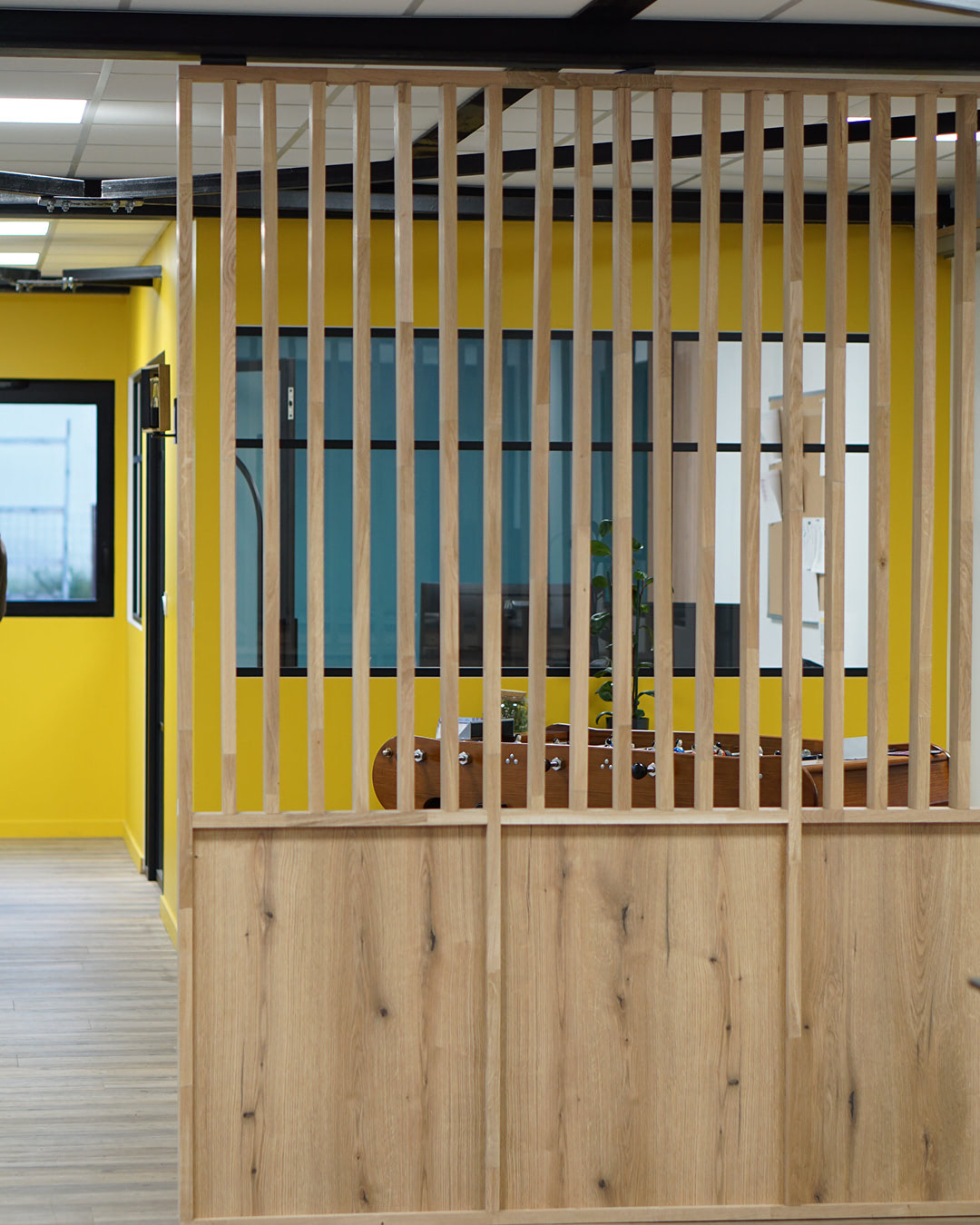 Bureau : Dans un espace de travail, un claustra en bois peut être utilisé pour créer des zones de travail individuelles, favorisant ainsi la concentration tout en maintenant une atmosphère ouverte et collaborative. le claustra en bois sert de séparateur d'espaces qui vous aide à délimiter et à organiser votre bureau de manière plus efficace. Que ce soit pour séparer votre espace de travail de votre zone de repos, créer une salle de réunion privée ou simplement délimiter votre espace personnel dans un bureau partagé, le claustra vous offre une solution flexible et esthétique. De plus, contrairement aux murs pleins et au delà de son occultation partielle, le claustra en bois permet une circulation optimale de la lumière et de l'air dans votre bureau, contribuant à un environnement de travail lumineux et aéré. C'est un aspect crucial pour maximiser votre confort et votre productivité.
