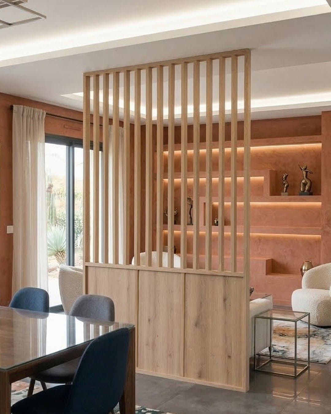 Séparation de pièces : Si vous voulez séparer deux espaces tout en laissant passer la lumière naturelle sans perdre l'effet d'ouverture, un claustra en bois est la solution idéale. Que ce soit pour diviser une pièce en deux zones distinctes, comme un espace de travail et un coin détente, ou pour créer une chambre à coucher semi-ouverte, les claustras en bois sur mesure peuvent être conçus pour s'adapter parfaitement à votre espace et faire office de séparations déco.